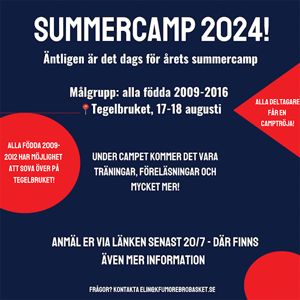 Äntligen är det dags för summercamp 2024 som kommer äga rum på Tegelbruket mellan den 17 - 18 augusti för spelare födda mellan 2009-2016! Det finns även möjlighet för spelare födda 2009-2012 att sova kvar på Tegelbruket över natten!🏀☺