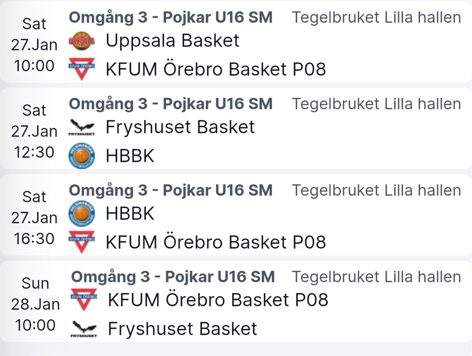 Nästa helg spelar KFUM Örebro basket P08 omgång 3 i USM. Nu fyller vi hallen hela helgen och tittar på spännande basket. Coacher- vi har mailat ut ett schema där era spelare behöver vara med och hjälpa till med arrangemanget. / Jenny Eriksson