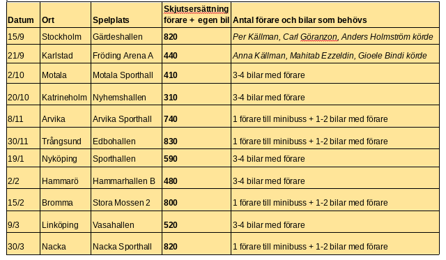 Sammanfattning om skjutskostnader och skjutsersättning säsongen 2024/2025 Spelare - 250 kr per bortamatch Förare med egen bil - 20 kr per mil (Tegelbruket-matchens spelplats) Förare av minibuss - ingen ersättning Detta kommer att gälla kring skjuts säsongen 2024/2025: - uttagna spelare betalar 250 kr per bortamatch oavsett resans avstånd. (Kostnaden kan minska under säsongen om laget/spelarna gör fler aktiviteter som drar in pengar som kan subventionera resorna.) - de som skjutsar spelare till bortamatch med egen bil kommer att ersättas med 20 kr per mil. chansen att bli uttagen till match ökar för de spelare som ser till att frivilliga närstående vuxna skriver in sig i skjutsschemat. - den spelare som har en närstående som skjutsar till bortamatch kommer inte att behöva betala skjutskostnad för aktuell match. - de som skriver upp sig i skjutsschemat kommer bara skjutsa om “deras” spelare blir uttagen . - de spelare som inte betalar för skjuts i enlighet med de instruktioner som kommer att skickas ut inför varje match, kan komma att inte bli uttagna till kommande matcher. Skjutsersättning enl nedan: 15/9, Stockholm Gärdeshallen = 820 kr 21/9 Karlstad Fröding Arena A = 440 kr 2/10 Motala Motala Sporthall = 410 kr 20/10 Katrineholm Nyhemshallen = 310 kr 8/11 Arvika Arvika Sporthall = 740 kr 30/11 Trångsund Edbohallen = 830 kr 19/1 Nyköping Sporthallen = 590 kr 2/2 Hammarö Hammarhallen B = 480 kr 15/2 Bromma Stora Mossen 2 = 800 9/3 Linköping Vasahallen = 520 kr 30/3 Nacka Nacka Sporthall = 820 kr Vilken match vi hade på Idrottshuset i lördags! Hoppas att nästa i Motala blir minst lika spännande men att vi vinner :) Fyll i skjuts- och sekretariatsschema Herr Utveckling 1 29 sep 2024 2kommentarer